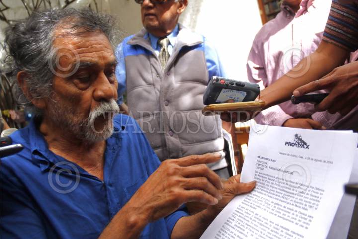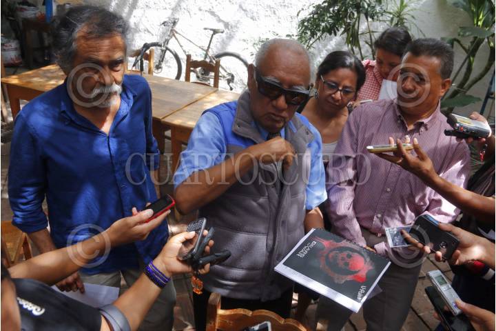 OAXACA, OAXACA, 04SEPTIEMBRE2015.- El fundador del Patronato Pro Defensa y Conservación del Patrimonio Cultural y Natural del Estado de Oaxaca (Pro-Oax), Francisco Toledo y el presidente de la organización, José Márquez ofrecieron una conferencia de prensa en el Instituto de Artes Gráficas de Oaxaca (IAGO) para acusar la intromisión de Harriet Turner quien haciéndose pasar como embajadora de la Paz de la Unesco, legitimó la construcción del Centro Cultural y de Convenciones de Oaxaca (CCCO), proyecto que impulsa el gobierno de Gabino Cué en el Cerro del Fortín. El artista plástico señaló que Pro Oax ha sostenido contacto directo con la UNESCO en París donde se encuentra la sede de la división del Patrimonio Edificado quienes ya analizan el proyecto gubernamental. FOTO: ARTURO PÉREZ ALFONSO /CUARTOSCURO.COM