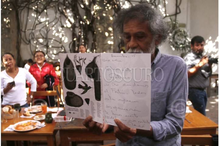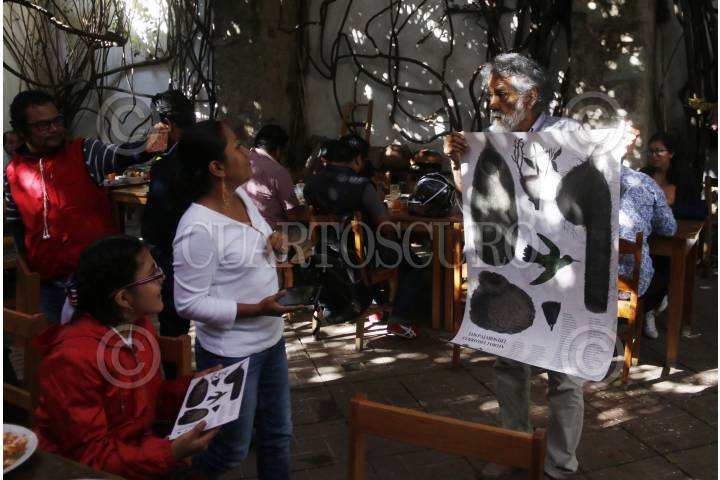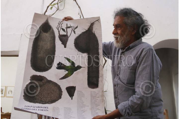 OAXACA, OAXACA, 15DICIEMBRE2015.- El pintor y fundador de Pro Oax, Francisco Toledo ofreció un desayuno a los representantes de los medios de comunicación en las instalaciones del Instituto de Artes Gráficas de Oaxaca (Iago) donde informó que enviará una segunda carta al gobernador, Gabino Cué para solicitar nuevamente una audiencia, ya que desde el 30 de noviembre entregaron un documento pidiendo al mandatario una reunión para presentar un proyecto de reforestación del cerro del Fortín. Además presentó un cartel en el que se enumeran más de 100 aves que habitan en el cerro del Fortín y que si no se cuida el espacio podrían desaparecer. FOTO: ARTURO PÉREZ ALFONSO /CUARTOSCURO.COM