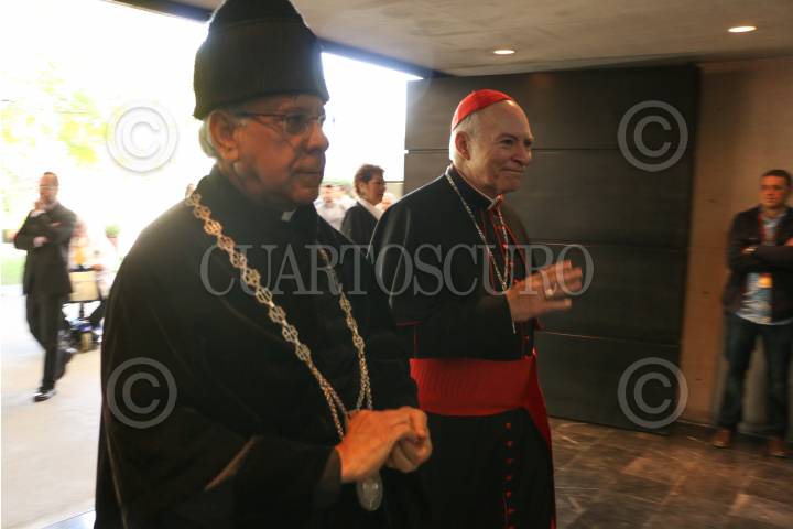 CIUDAD DE MÉXICO, 30ENERO2019.- Mario Ángel Flore Ramos, rector de la Universidad Pontificia de México (UPM), y Carlos Aguiar Retes, Arzobispo Priado de México, durante la conmemoración de aniversario de la UPM, en donde se realizó un foro en el que se analizaron problemáticas actuales como; migrantes, seguridad, el papel de la mujer en la sociedad, las expectativas para México en el 2019 y el rol que tiene la iglesia sobre estos temas. FOTO: ROGELIO MORALES / CUARTOSCURO.COM