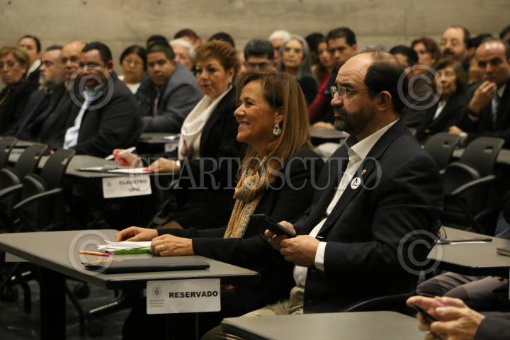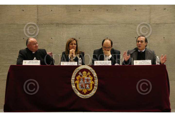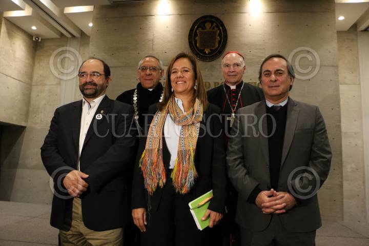 CIUDAD DE MÉXICO, 30ENERO2019.- Emiliano Álvarez Icaza Longoria, quien funge como senador ciudadano, Mario Ángel Flore Ramos, rector de la Universidad Pontificia de México (UPM), Margarita Ester Zavala Gómez del Campo, quien ahora es la directora de la asociación civil "Con vocación Política", Carlos Aguiar Retes, Arzobispo Priado de México y Juan Pablo Castañón Castañón, actual presidente del Consejo Coordinador Empresarial, durante la conmemoración de aniversario de la UPM, en donde se realizó un foro en el que se analizaron problemáticas actuales como; migrantes, seguridad, el papel de la mujer en la sociedad, las expectativas para México en el 2019 y el rol que tiene la iglesia sobre estos temas. FOTO: ROGELIO MORALES / CUARTOSCURO.COM