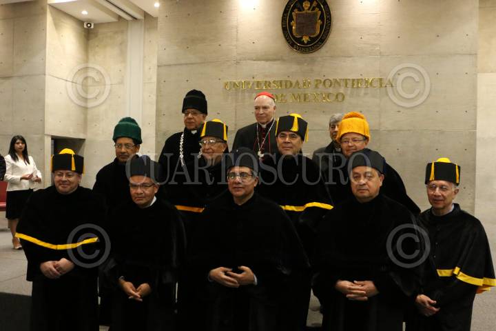 CIUDAD DE MÉXICO, 30ENERO2019.- Mario Ángel Flore Ramos, rector de la Universidad Pontificia de México (UPM) y Carlos Aguiar Retes, Arzobispo Priado de México, junto a rectores y directores de distintas universidades, durante la conmemoración de aniversario de la UPM, en donde se realizó un foro en el que se analizaron problemáticas actuales como; migrantes, seguridad, el papel de la mujer en la sociedad, las expectativas para México en el 2019 y el rol que tiene la iglesia sobre estos temas. FOTO: ROGELIO MORALES / CUARTOSCURO.COM