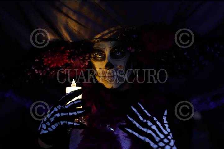 CIUDAD DE MÉXICO, 27OCTUBRE2024.- Una catrina que participa en la procesión de este año posa para las cámaras. FOTO: DANIEL AUGUSTO/ CUARTOSCURO.COM
