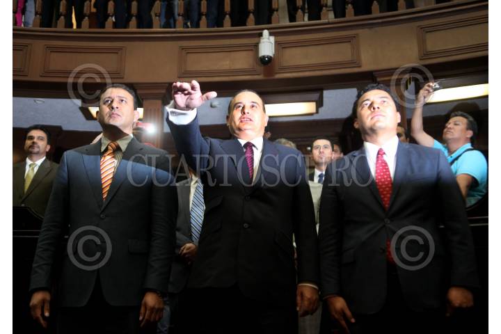 MORELIA, MICHOACÁN, 22AGOSTO2015.- Luego de presentar su renuncia irrevocable al cargo en marzo pasado, este sábado por mayoría el Congreso local designó nuevamente a Martín Godoy Castro como procurador General de Justicia del Estado. Dos votos en contra tuvo la propuesta para designar a Godoy Castro, la de las legisladoras Talía Vázquez Alatorre y Cristina Portillo Ayala, en tanto que voto en abstención emitieron Uriel López Paredes y Araceli Gómez Sahagún, en tanto que los 32 legisladores restantes avalaron la propuesta. Es así como Godoy Castro acudió ante el Pleno dónde rindió protesta, misma que fue acompañada de aplausos de los diputados del PRI y PAN en tanto que los perredistas abandonaban presurosos el salón de sesiones. FOTO: ALAN ORTEGA /CUARTOSCURO.COM
