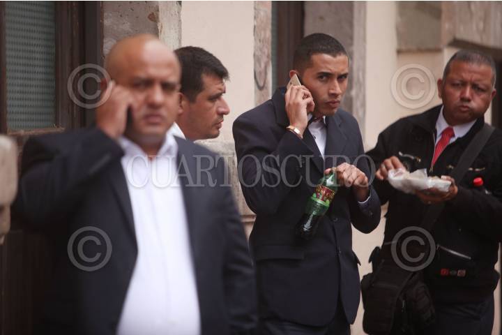 MORELIA, MICHOACÁN, 22AGOSTO2015.- Luego de presentar su renuncia irrevocable al cargo en marzo pasado, este sábado por mayoría el Congreso local designó nuevamente a Martín Godoy Castro como procurador General de Justicia del Estado. Dos votos en contra tuvo la propuesta para designar a Godoy Castro, la de las legisladoras Talía Vázquez Alatorre y Cristina Portillo Ayala, en tanto que voto en abstención emitieron Uriel López Paredes y Araceli Gómez Sahagún, en tanto que los 32 legisladores restantes avalaron la propuesta. Es así como Godoy Castro acudió ante el Pleno dónde rindió protesta, misma que fue acompañada de aplausos de los diputados del PRI y PAN en tanto que los perredistas abandonaban presurosos el salón de sesiones. En la imagen Policías Ministeriales resguardaron las inmediaciones del recinto legislativo. FOTO: ALAN ORTEGA /CUARTOSCURO.COM