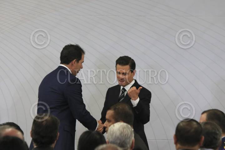 CIUDAD DE MÉXICO, 09DICIEMBRE2016.- Pablo Escudero, presidente de la mesa directiva del Senado de la República, saluda a Enrique Peña Nieto, presidente de la república, durante la clausura del Encuentro Nacional de Procuración e Impartición de Justicia realizado en Ciudad Judicial. FOTO: SAÚL LÓPEZ /CUARTOSCURO.COM