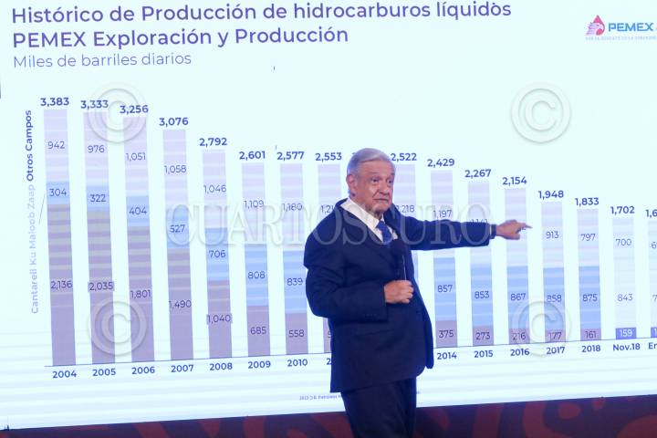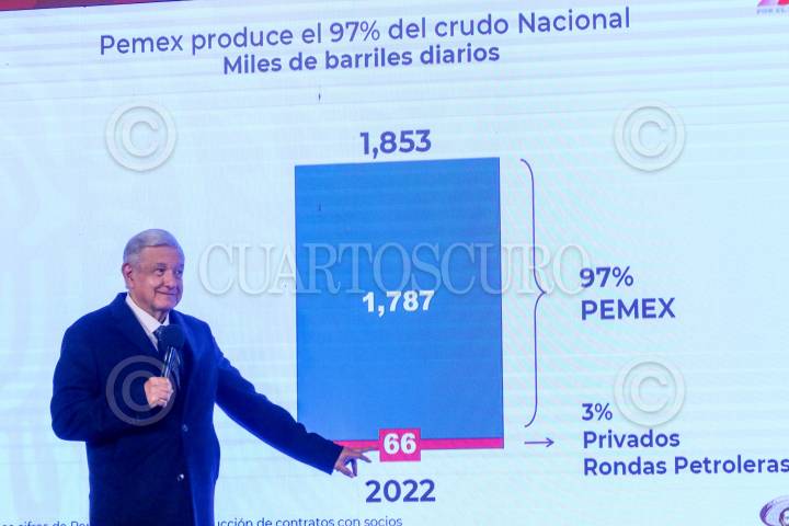 Andrés Manuel López Obrador, Presidente de México, muestra una gráfica en la que se resalta que Pemex produce el 97?l crudo en nuestro país, mientras que los privados solo el 3%.