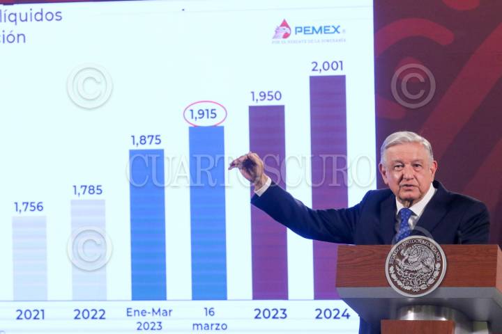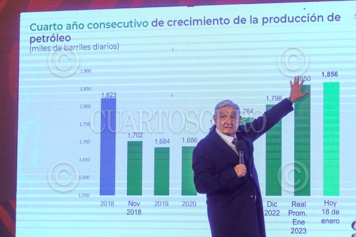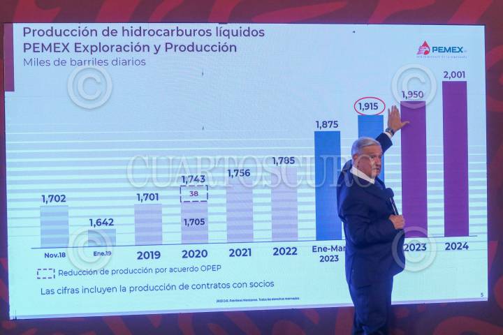 Andrés Manuel López Obrador, Presidente de México, muestra una gráfica en la que se muestra el crecimiento de la producción de petróleo por parte de Pemex.