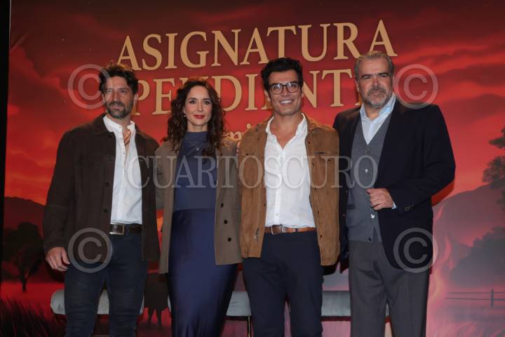 CIUDAD DE MÉXICO, 01JULIO2025. David Chocarro, Andrés Palacios y Susana González junto al productor Carlos Moreno durante la presentación de los protagonistas de la nueva telenovela “Asignatura pendiente, de mi vida” en instalaciones de Televisa San Ángel. FOTO: EDGAR NEGRETE LIRA/CUARTOSCURO.COM
