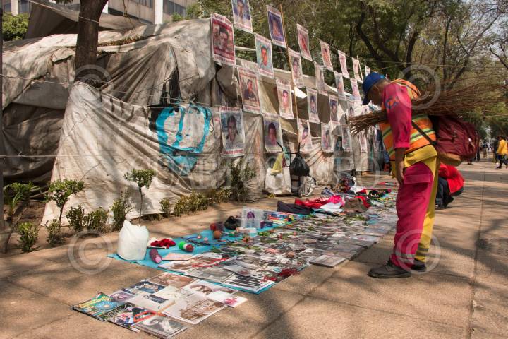 CIUDAD DE MÉXICO, 13FEBRERO2019.- A cuatro años de la desaparición de 43 estudiantes de la Normal Isidro Burgos, el campamento instalado por padres, maestros y familiares en Paseo de la Reforma, frente al edificio que albergo ha la desaparecida PGR, se ha convertido en parte del paisaje urbano, algunas de estas personas se mantienen con la venta de libretas, fotografías y cuadros en puestos improvisados sobre el suelo. FOTO: ROGELIO MORALES /CUARTOSCURO.COM