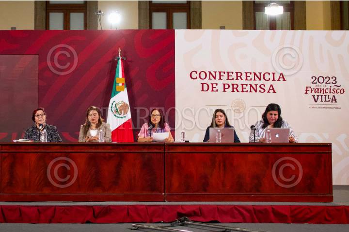 Marx Arriaga Navarro, Uziel Pérez López, Leticia Ramírez Amaya, Rogelio Díaz-Barriga Casales, , Ángel Rogelio Díaz-Barriga Casales y Claudia Nayeli López, durante la presentación de los nuevos libros de la SEP en Palacio Nacional.