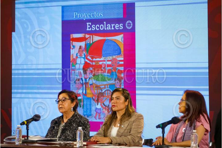 Graciela Sandoval, Anayeli Santiago Vázquez, Leticia Ramírez Amaya, durante la presentación del nuevo libro de primer grado de primaria.