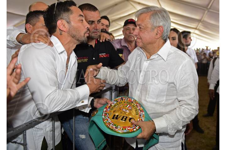 LOS MOCHIS, SINALOA, 09JUNIO2019.- Andrés Manuel López Obrador, Presidente de México, encabezó la entrega de los ”Programas Integrales para el Bienestar”, en Ahome. Lo acompañaron Quirino Ordaz Coppel, gobernador de la entidad y María Luisa Albores, Secretaria de Bienestar. En la imagen el ex campeón de boxeo peso supermosca, Fernando Montiel, le obsequió su cinturón. FOTO: PRESIDENCIA /CUARTOSCURO.COM