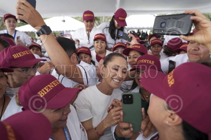 TLAQUEPAQUE, JALISCO, 25MAYO2025.- Claudia Sheinbaum, Presidenta de México; encabezó la firma de convenio de colaboración que celebraron la Secretaría de Bienestar y el IMSS para la implementación del programa de salud “Casa por Casa”. La cita fue ante la presencia de cientos enfermeras, enfermeros, médicos y médicas que llevarán servicios de salud a miles de hogares en todo el país, quienes se dieron cita en el almacén del IMSS Delegación Jalisco. FOTO: PRESIDENCIA/CUARTOSCURO.COM