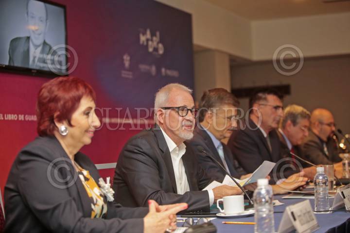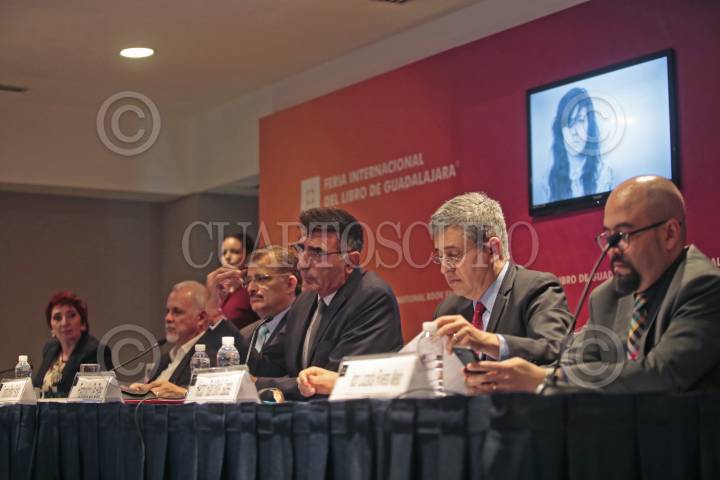 GUADALAJARA, JALISCO. 05OCTUBRE2017.- Raúl Padilla López Presidente de la Feria Internacional del Libro de Guadalajara (FIL), Tonatiuh Bravo Padilla Rector General de la Universidad de Guadalajara, Marisol Schuls Manaut Directora General de la Feria Internacional del Libro (FIL), Francisco Javier de Blas Zabaleta Vocal Asesor de la Coordinación General de la Alcaldía de Madrid, Héctor Raúl Solís Gadea Rector del Centro Universitario de Ciencias Sociales y Humanidades de la U. de G. e Igor Lozada Rivera Melo Secretario de Vinculación y Difusión cultural de la U. de G., encabezaron la conferencia de prensa para dar a conocer el programa general de actividades de la Feria Internacional del Libro de Guadalajara 2017 que se llevó a cabo en el Hotel Hilton. FOTO: FERNANDO CARRANZA GARCIA / CUARTOSCURO.COM