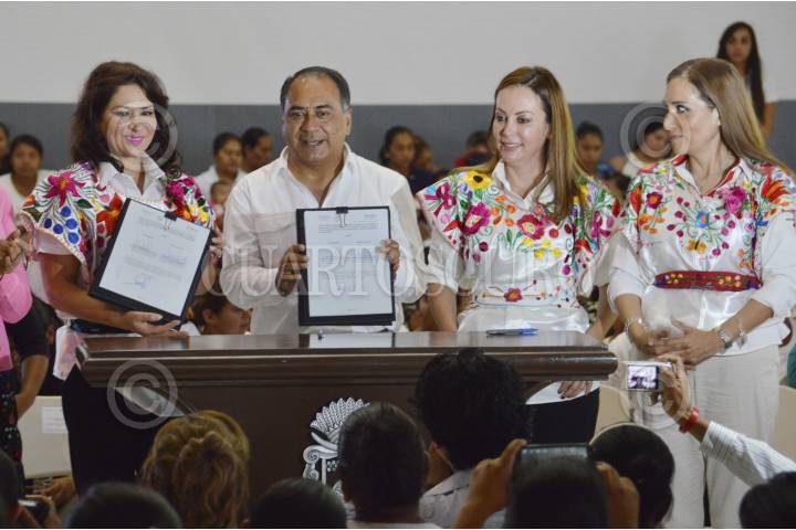 CHILPANCINGO, GUERRERO, 13DICIEMBRE2016.- Laura Vargas Carrillo, directora general del DIF nacional; Paula Hernández Olmos, coordinadora general del programa Prospera, Mercedes Calvo de Astudillo y el gobernador Héctor Astudillo, encabezaron la entrega de de Mi Cuna Prospera y la firma del convenio DIF –Prospera, que se llevó a cabo en la Casa Guerrero. FOTO: JOSÉ I.HERNÁNDEZ / CUARTOSCURO.COM