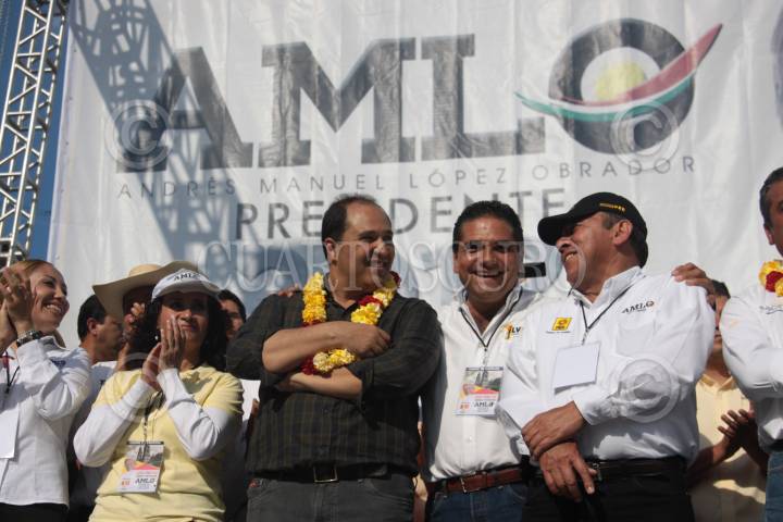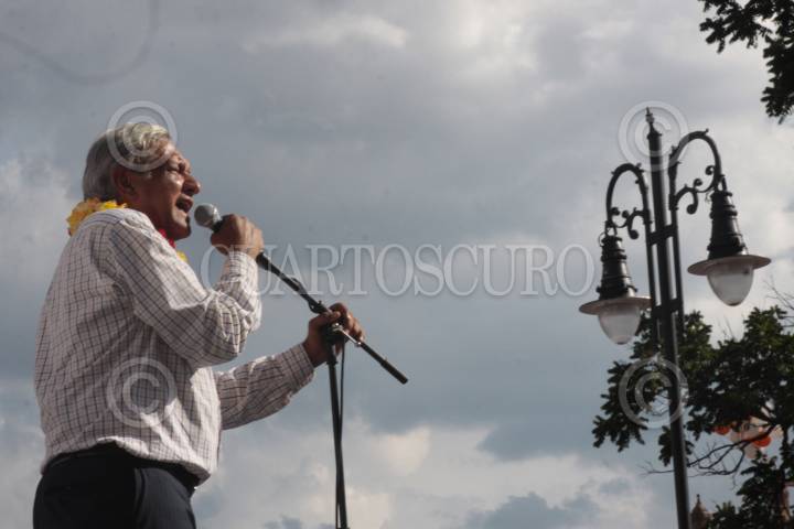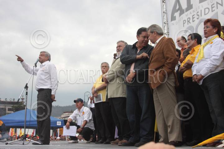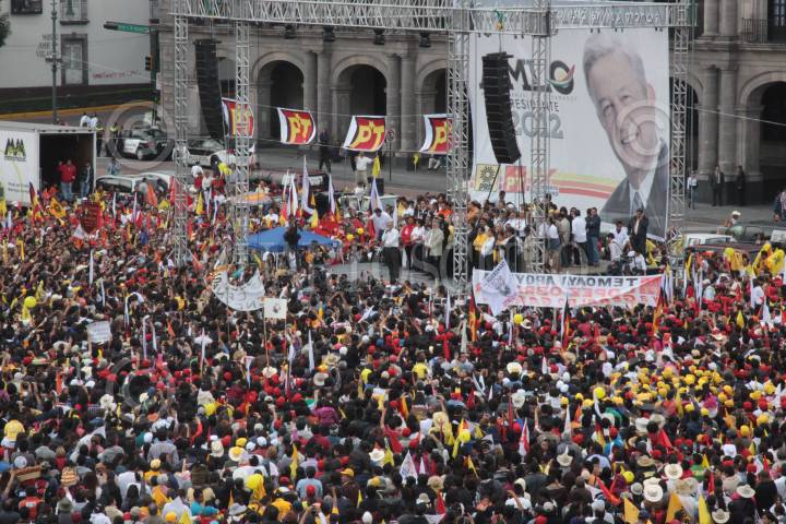 MORELIA, MICHOACÁN, 25JUNIO2012.- Andrés Manuel López Obrador, candidato de la Coalición Movimiento Progresista a la rpesidencia de la república, encabezó un cierre de campaña en la capital del estado. Dolores Padierna; Lázaro Cárdenas Batel, exgobernador del estado; Silvano Aureoles Conejo y Jesús Zambrano Grijalva, estuvieron presentes en el mitin. FOTO: IVÁN STEPHENS /CUARTOSCURO.COM