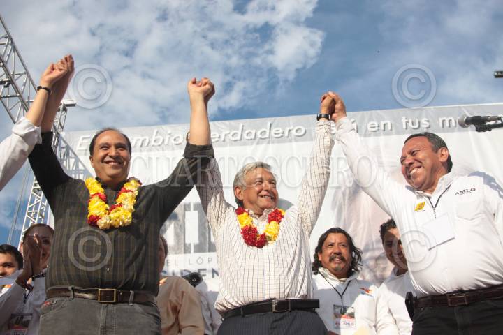 MORELIA, MICHOACÁN, 25JUNIO2012.- Andrés Manuel López Obrador, candidato de la Coalición Movimiento Progresista a la rpesidencia de la república, encabezó un cierre de campaña en la capital del estado. Lázaro Cárdenas Batel, exgobernador del estado; y Jesús Zambrano Grijalva, dirigente nacional del PRD; estuvieron presentes en el mitin. FOTO: IVÁN STEPHENS /CUARTOSCURO.COM