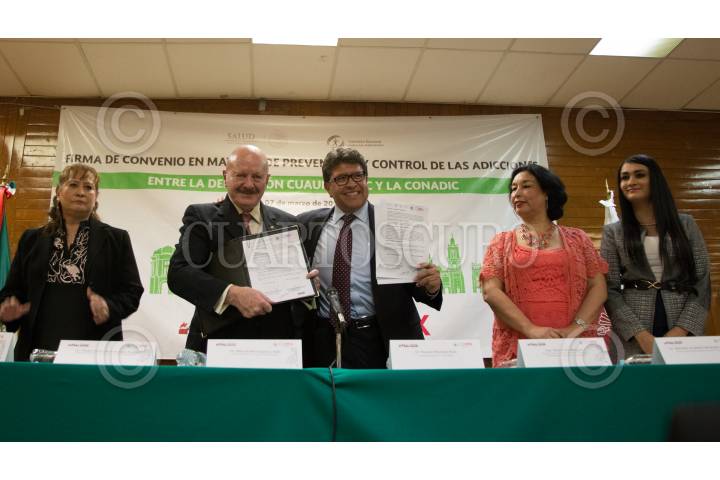 CIUDAD DE MÉXICO, 07MARZO2016.- María rosario Tapia Medina, Directora General del Instituto para la Atención y Prevención de las Adicciones en la CDMX; Pedro Pablo de Antuñano Padilla, General de Jurídico y Gobierno Cuauhtémoc; Manuel Mondragón y Kalb, Comisionado Nacional Contra las Adicciones (Conadic); Ricardo Monreal Ávila, Jefe Delegacional de Cuauhtémoc; Nora Frías Melgoza, Directora General de Coordinación y Vinculación Interinstitucional, Nacional e Internacional; y Bennelly Jocabeth Hernández Ruedas, Directora General de Desarrollo Social en Cuauhtémoc, participaron en la firma del convenio de colaboración entre el Conadic y la Delegación Cuauhtémoc, con el propósito de combatir el consumo de drogas en la zona. FOTO: TERCERO DÍAZ /CUARTOSCURO.COM