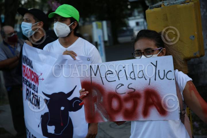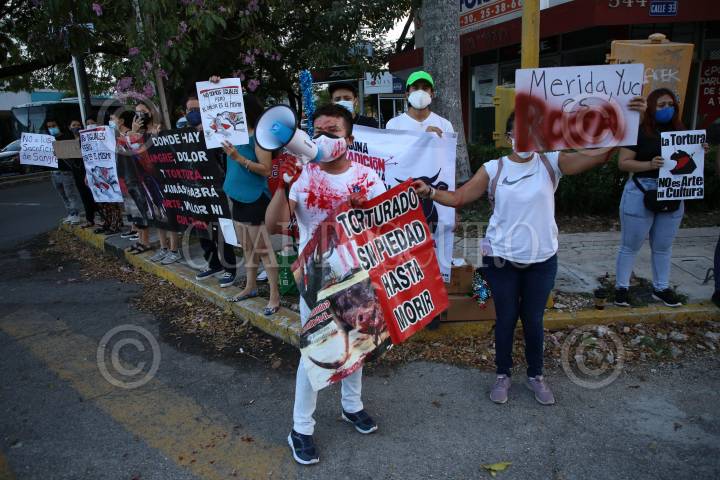 Un grupo de activistas antitaurinos se congregaron a las afueras de la Plaza de Toros Mérida para manifestarse en contra de la segunda corrida de toros del año, argumentan que no deben realizarse este tipo de espectáculos.