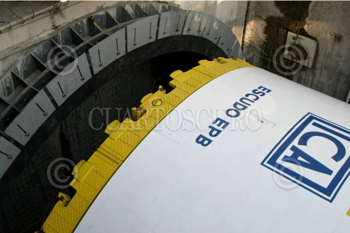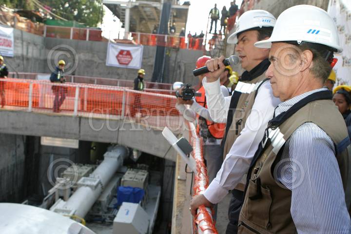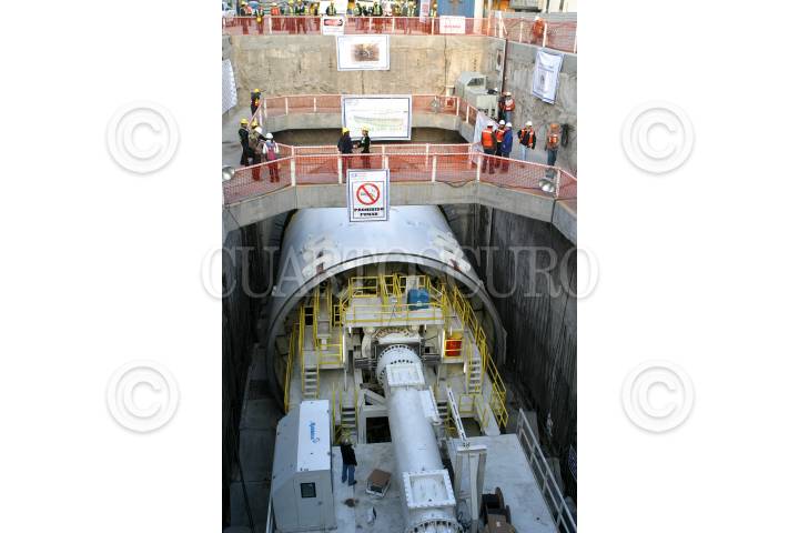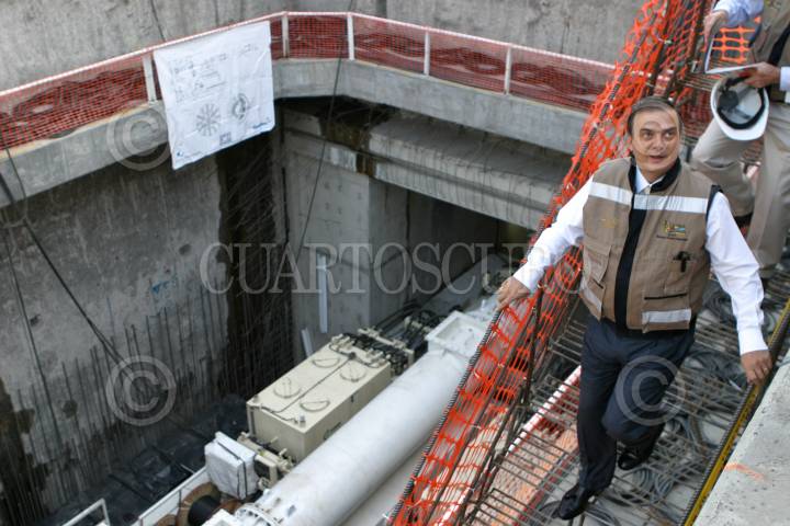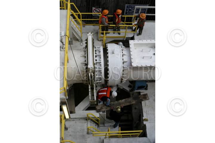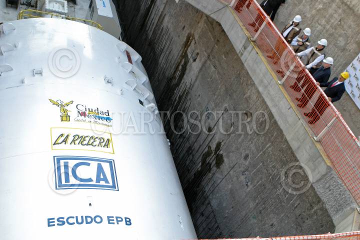 MÉXICO D.F., 07ENERO2010.- El escudo, una gigantesca excavadora encargada de hacer el túnel para el tramo subterráneo de la Línea 12 del Metro fue puesto en operación por el jefe de gobierno del Distrito Federal, Marcelo Ebrard Casaubon, esto en donde estará la estación Mexicaltzingo en la calle Centeno y avenida Ermita Iztapalapa. Este perforador subterráneo de 105 metros de largo, conocido como “Escudo de Presión Balanceada” perforará 8 kilómetros desde la calle Centeno a Mixcoac a una velocidad promedio de 12 metros al día a partir de hoy y hasta septiembre de 2011. FOTO: RODOLFO ANGULO/CUARTOSCURO.COM