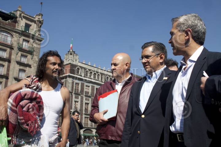 MÉXICO, D.F., 28ENERO2012.- El candidato de las izquierdas Miguel Ángel Mancera, presentó a parte de sus colaboradores en lo que será su campaña con miras a la Jefatura de Gobierno, entre los que se encuentra Joel ortega, quien será su coordinador. El ex-procurador se paseo por la plancha del Zócalo en donde una hombre le pidió empleo y este le contesto que de ganar lo buscará. FOTO: MOISÉS PABLO/CUARTOSCURO.COM