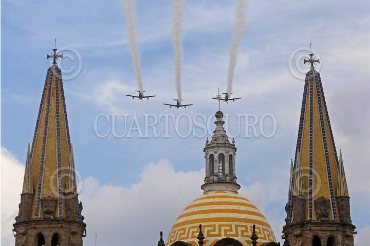Aviones de la Fuerza Aérea Militar, cruzan las torres de la Catedral de Guadalajara, este medio día en la ciudad.