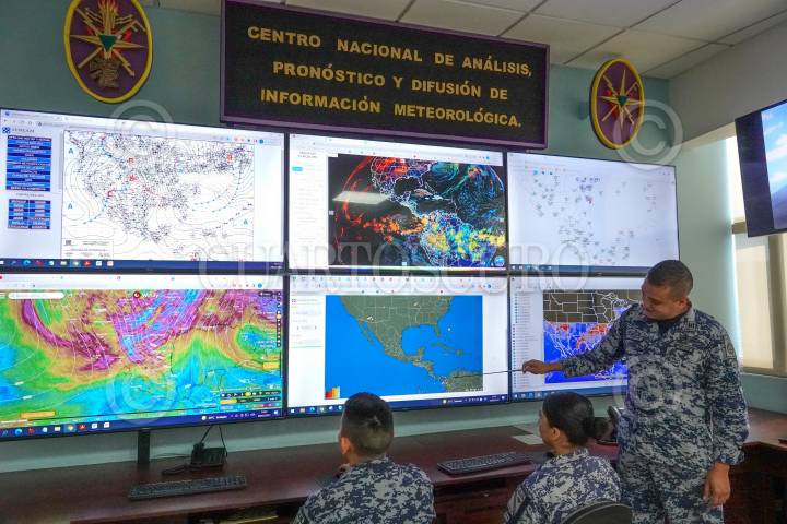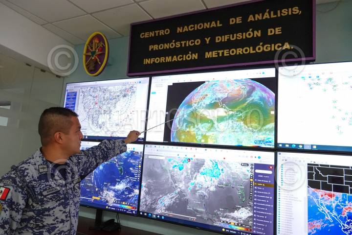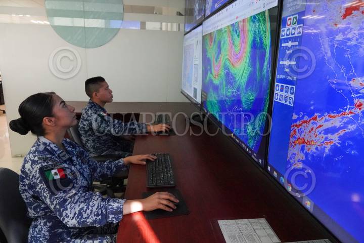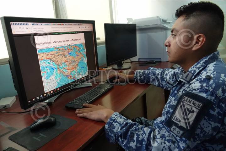 Elementos de la Fuerza Aérea Mexicana durante el análisis y pronóstico del Sistema Meteorológico para la prevención de huracanes, sequías e incendios forestales