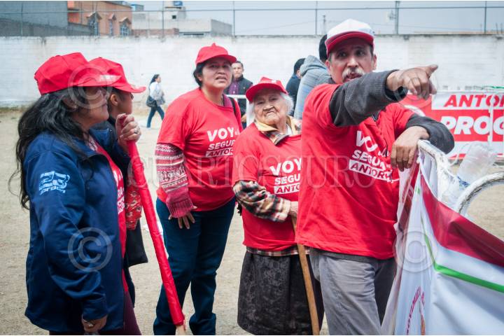 TECAMAC, ESTADO DE MÉXICO, 19MAYO2017.- Albañiles de una construcción tapizada por propaganda del candidato por el PRI, Alfredo del Mazo, escuchan el mitin que realizaron la maestra Delfina Gómez, candidata al gobierno del estado por MORENA, y Andrés Manuel López Obrador, líder nacional de dicho partido, en la cabecera municipal. FOTO: DIEGO SIMÓN SÁNCHEZ /CUARTOSCURO.COM