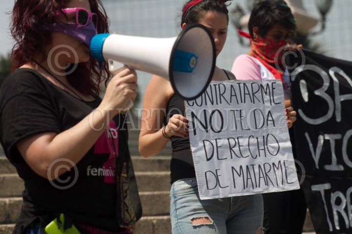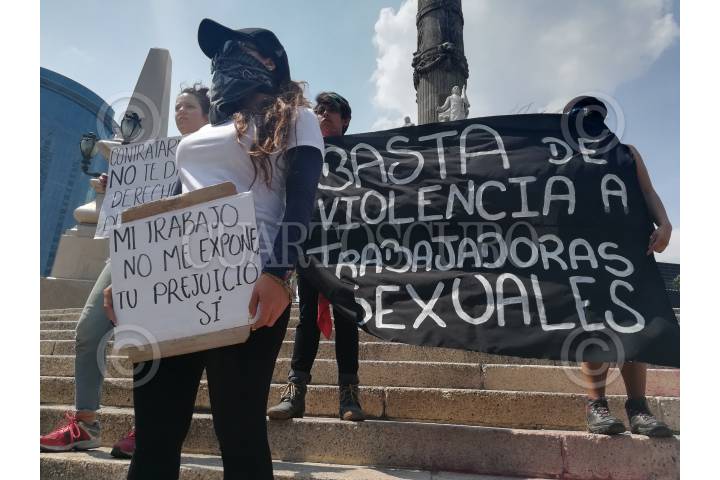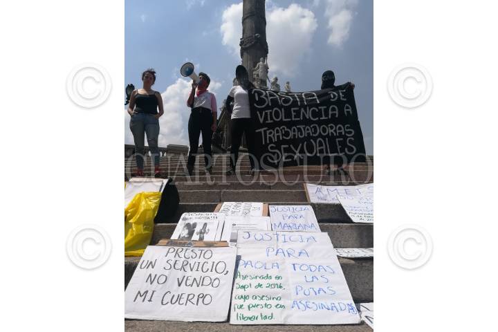CIUDAD DE MÉXICO, 06MARZO2018.- Trabajadoras sexuales se manifestaron en las escalinatas del Ángel de la Independencia para pedir un alto a los asesinatos de mujeres que ejercen este oficio, en los últimos meses varias han sido asesinadas en hoteles en la ciudad, sin que se haya encontrado a los culpables. Las manifestantes pidieron respeto a su derechos de ejercer la prostitución, pero que esta decisión no las hace blanco de agresiones, ya que acusaron a lo medios de comunicación de estigmatizarlas de ser víctimas de trata de blancas. Una de sus pancartas decía "Presto un servicio, no vendo mi cuerpo". FOTO: MOISÉS PABLO /CUARTOSCURO.COM