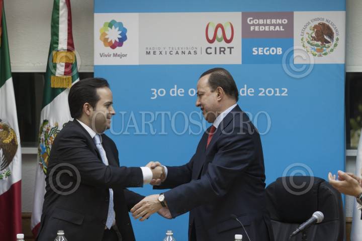 MÉXICO, D.F. 30OCTURBRE2012.- Alejandro Poiré, secretario de Gobernación, y Tristan Canales Najar, presidente de la CIRT, durante la firma de un convenio para concertar acciones en la implementación del mecanismo para la protección de periodistas y defensores de derechos humanos. FOTO: MOISÉS PABLO /CUARTOSCURO.COM