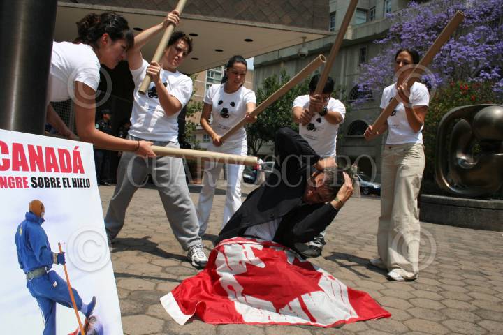 MÉXICO, D.F., 29MARZO2007.- Activistas de Anima Naturalis simularon golpear a un funcionario de la embajada canadiense en protesta por la matanza de focas en ese país. FOTO: ISAAC ESQUIVEL/CUARTOSCURO.COM