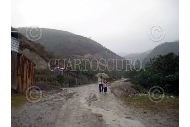 CHILPANCINGO, GUERRERO 17ENERO2009.- Una señora acompañada de su pequeña hija se protegen con un paraguas y caminan con dificultad por el acceso principal a la colonia Barranca de Chuchululuya, debido a la pertinaz lluvia que se registro durante todo el fin de semana en la capital del estado. FOTO: OSCAR ALVARADO/CUARTOSCURO.COM