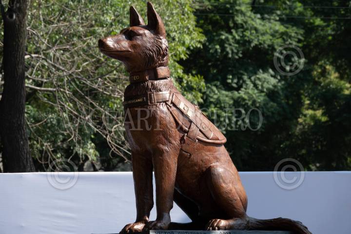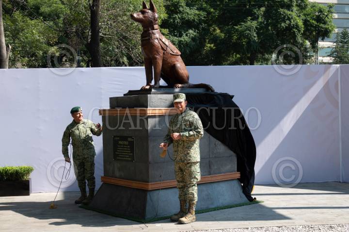 CIUDAD DE MÉXICO, 21SEPTIEMBRE2023.- Luis Cresencio Sandoval, secretario de la Defensa Nacional (SEDENA), encabezó la develación de la escultura en honor al perro Proteo, fallecido durante las labores humanitarias por parte del ejército mexicano en el terremoto de Turquía. FOTO: GALO CAÑAS/CUARTOSCURO.COM