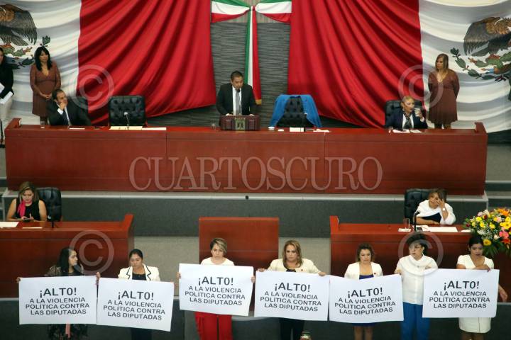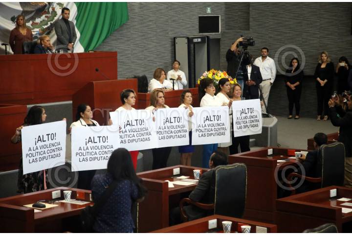 CUERNAVACA, MORELOS, 01SEPTIEMBRE2019.- Las diputadas Rosalinda Rodríguez Tinoco (PRD), Maricela Jiménez Armendáriz (Movimiento Ciudadano), Naida Díaz Roca (independiente), Tania Valentina Rodríguez, Erika García (PT), Blanca Nieves Sánchez (Nueva Alianza) y Keila Celene Figueroa (MORENA) protestan con pancartas con el mensaje “Alto a la violencia política contra las diputadas” durante el mensaje que dirige el presidente del congreso morelense, Alfonso Sotelo Martínez, por el inicio del segundo año de actividades legislativas. FOTO: MARGARITO PÉREZ RETANA /CUARTOSCURO.COM