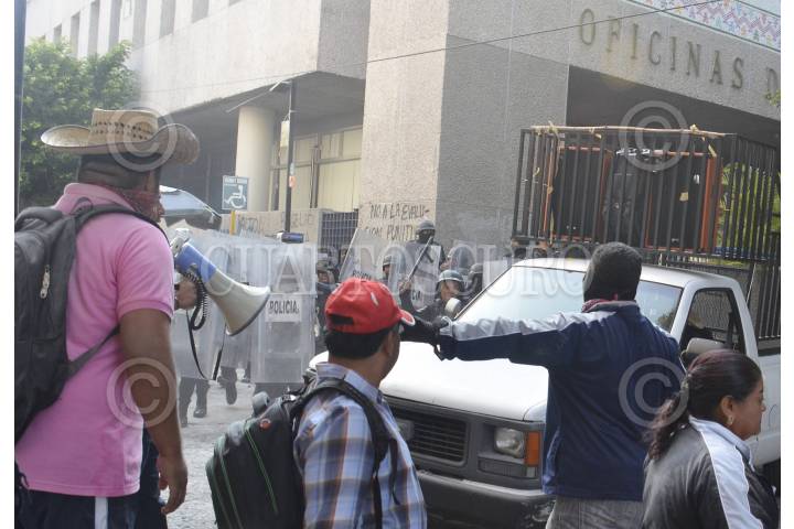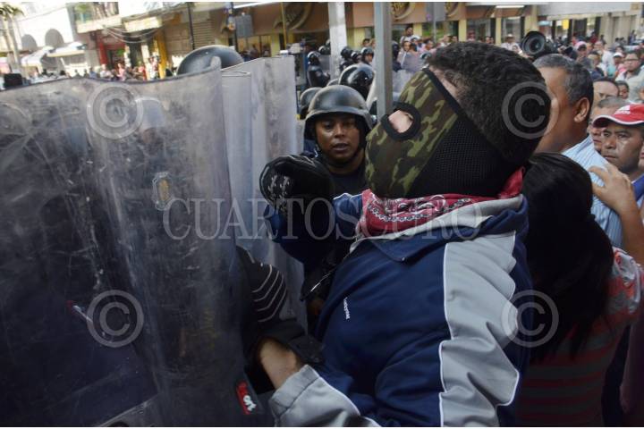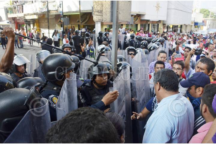 CHILPANCINGO,GUERRERO.04OCTUBRE2016.-Policías antimotines de Guerrero replegaron a profesores de la CETEG cuando protestaban frente a las oficinas de las oficinas de finanzas. Los profesores disidentes responsieron lanzando piedras y palos a los uniformados quienes repelieron la agresión lanzando gas lacrimógeno. FOTO: JOSÉ I. HERNÁNDEZ / CUARTOSCURO.COM
