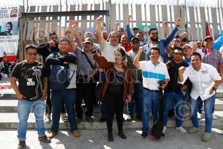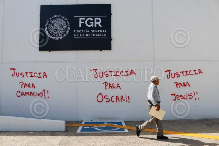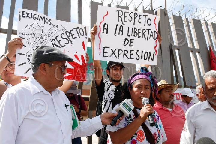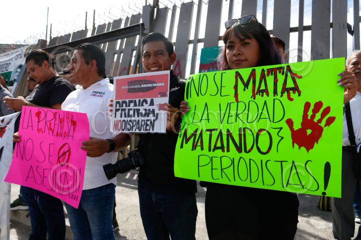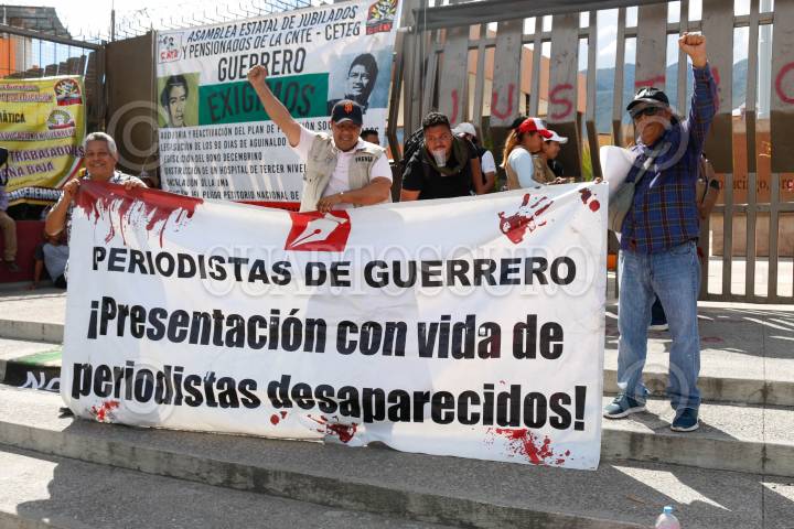 CHILPANCINGO, GUERRERO, 31OCTUBRE2024.- Periodistas de la capital del estado hicieron un mitin afuera de la Fiscalía General de la República (FGR), para exigir justicia por el asesinato de los comunicadores Mauricio Cruz Solís en Michoacán y Patricia Ramírez González, conocida como Paty Bunbury en Colima. Demandaron un alto a las agresiones como el caso de Alberto Toledo Denova, hijo del periodista Marco Antonio Toledo, quien por segunda ocasión fue privado de su libertad y tras nueve horas fue localizado golpeado en el municipio de Taxco de Alarcón. Además de que los dos recientes asesinatos a periodistas deben encender las alarmas y mantener alerta a los periodistas de Guerrero, ya que es una entidad donde la impunidad campea porque desde hace tres sexenios no se ha investigado ningún caso de agresión ni asesinato contra el gremio. Lamentando que en los primeros 30 días del sexenio de la presidenta Claudia Sheinbaum se hayan registrado dos asesinatos y una agresión contra periodistas. FOTO: DASSAEV TÉLLEZ ADAME/CUARTOSCURO.COM
