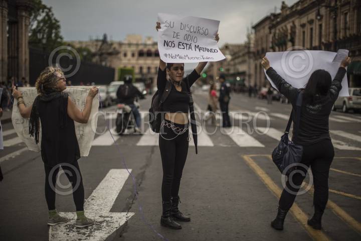 MORELIA, MICHOACÁN, 19OCTUBRE2016.- La Coordinadora de Feministas en Michoacán convocó para protestar frente a Palacio de Gobierno contra los feminicidios en el estado y al llamado"Miércoles Negro", en solidaridad después del asesinato de la adolescente Lucía en Argentina. Mujeres de todas las edades gritaron consignas y mostraron pancartas de protesta obstruyendo por casi una hora la circulación de automoviles en la arteria principal de la ciudad. FOTO: ALAN ORTEGA /CUARTOSCURO.COM