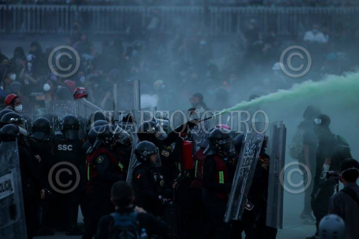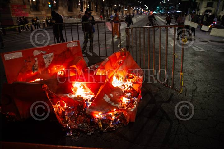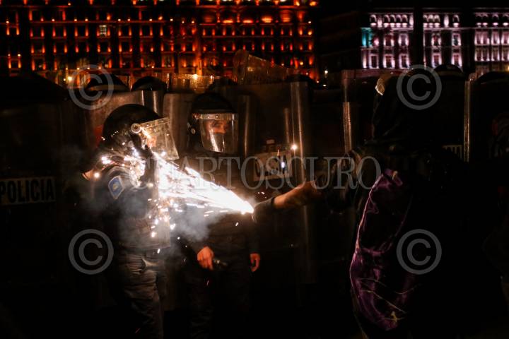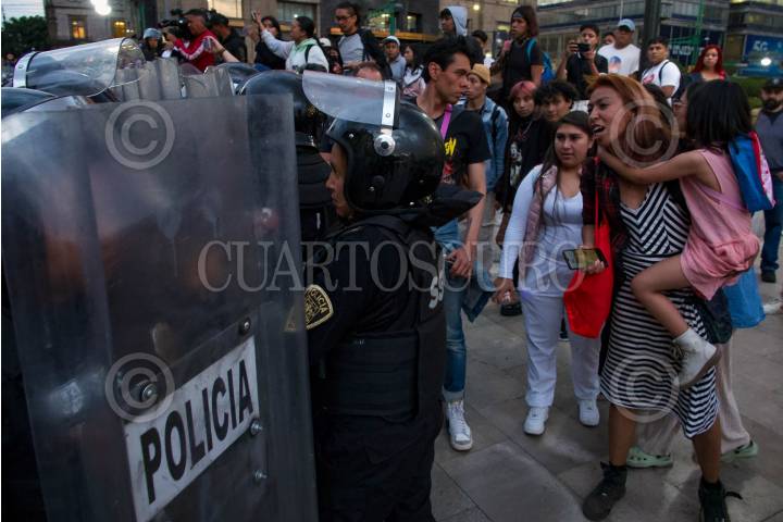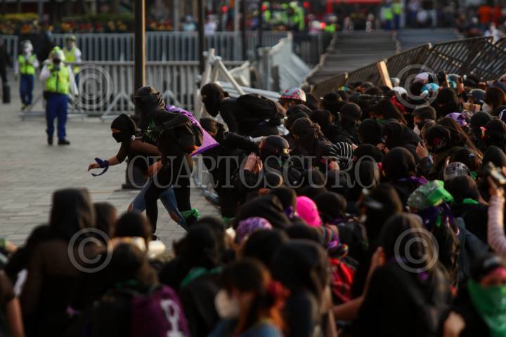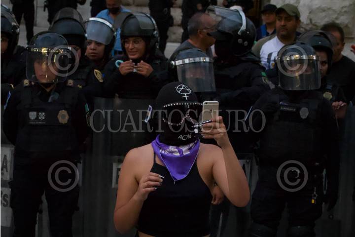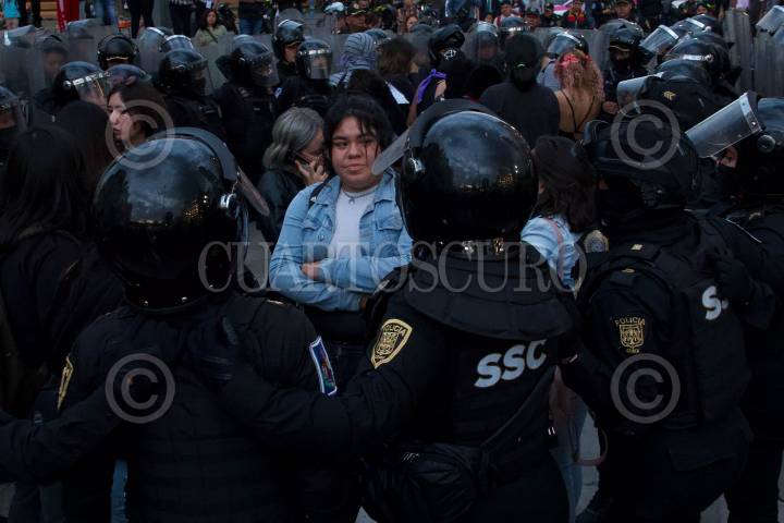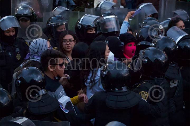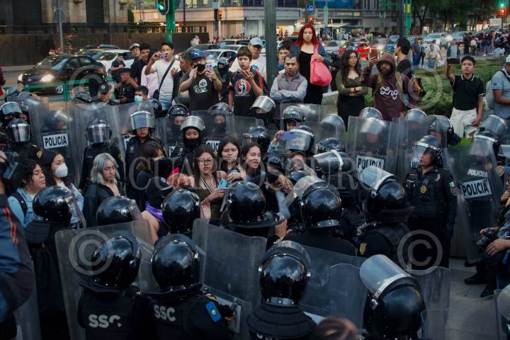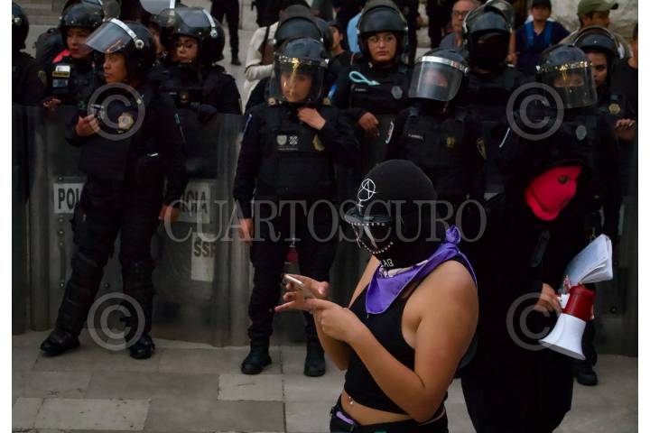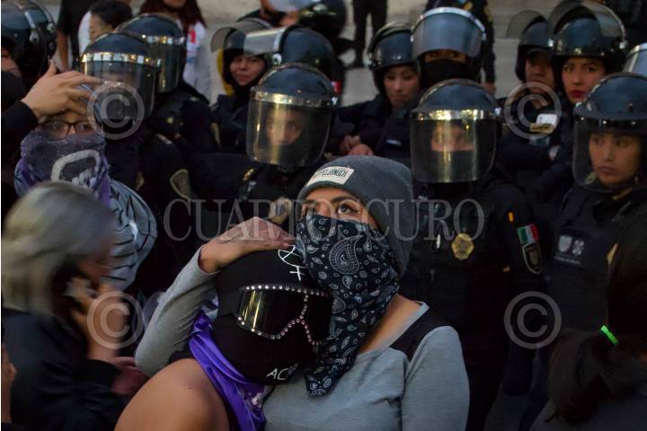 Equipo Atenea de la policía capitalina durante encapsulado de al menos 20 feministas en Bellas Artes.