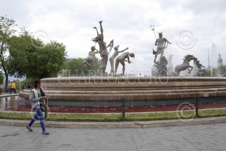 09MARZO2020.- La fuente de la vida, mejor conocida como la fuente de Neptuno ubicada en la Macroplaza en el centro de Monterrey, lució con el agua de color rojo, tras la marcha del día internacional de la mujer. FOTO: GABRIELA PÉREZ MONTIEL / CUARTOSCURO.COM