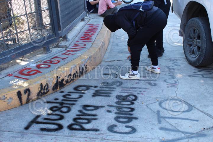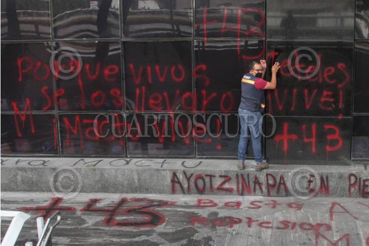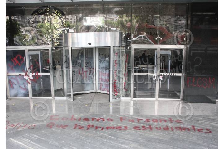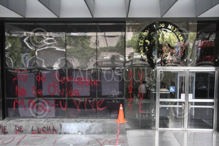 Aspectos de la sede la FGJ tras protesta de normalistas.