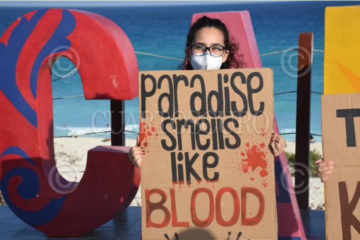 Manifestantes marchan en la zona hotelera de Cancún para exigir justicia por los feminicidios en este destino turístico.
