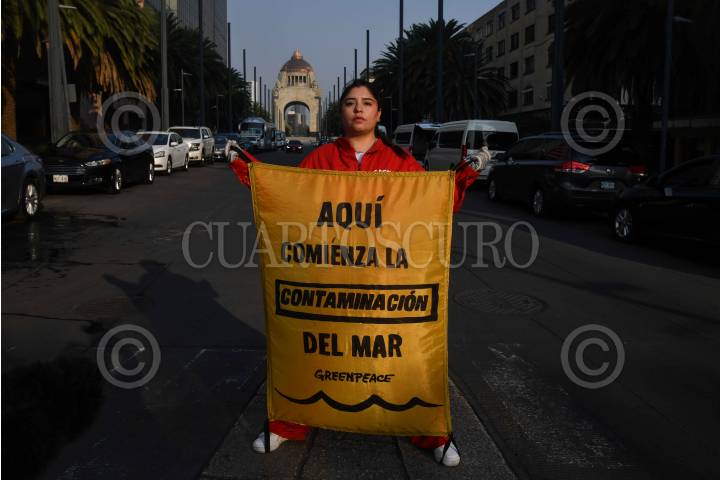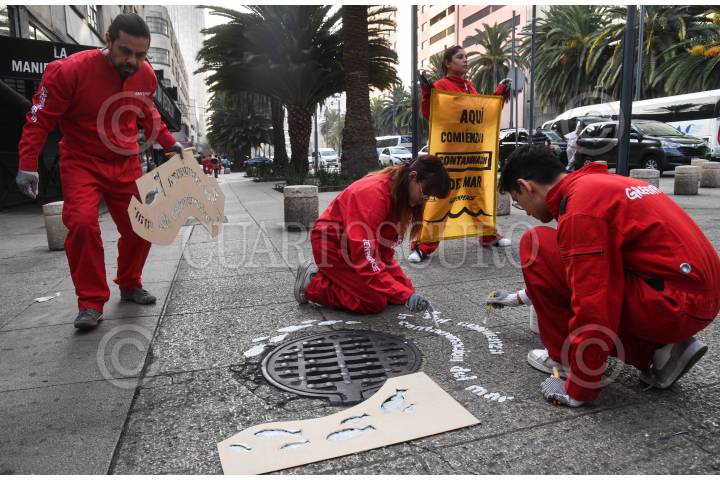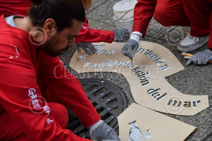 CIUDAD DE MÉXICO, 07JUNIO2024.- Activistas de la organización "Greenpeace México" colocaron en los alrededores de las alcantarillas públicas que rodean la Plaza de la República la frase "Aquí comienza la contaminación del mar" con pintura biodegradable. Esto con la intención de mostrar a la ciudadanía la importancia de actuar por Océanos sin plásticos, en el marco del día mundial de los océanos. FOTO: MARIO JASSO/CUARTOSCURO.COM