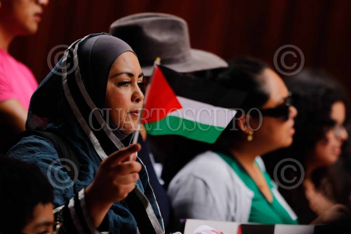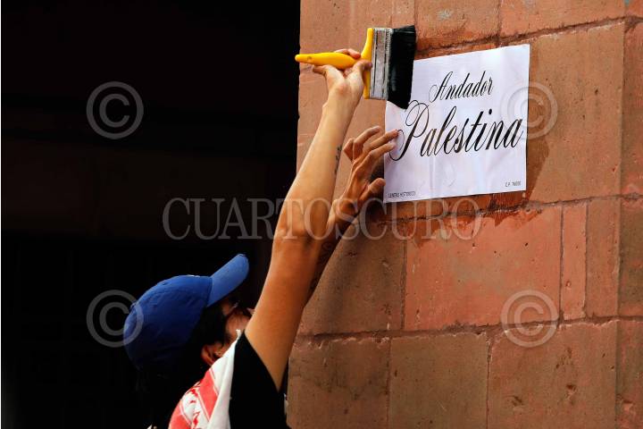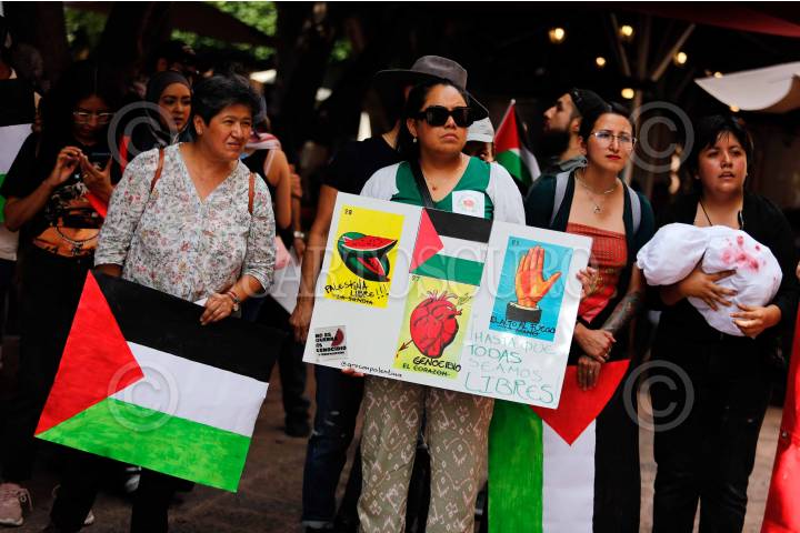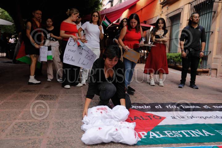 QUERÉTARO, QUERÉTARO, 20JULIO2024.- El colectivo "Qro con Palestina" convocó a una manifestación pacífica que comenzó en el jardín Guerrero y culminó en plaza de armas. En en el evento hubo micrófono abierto donde los activistas expresaron su sentir referente a la ocupación que lleva a cabo Israel en territorio palestino desde 1948. FOTO: CÉSAR GÓMEZ/CUARTOSCURO.COM