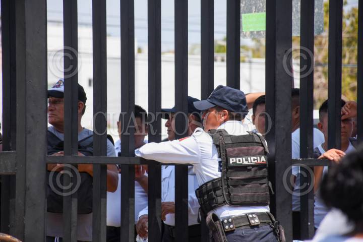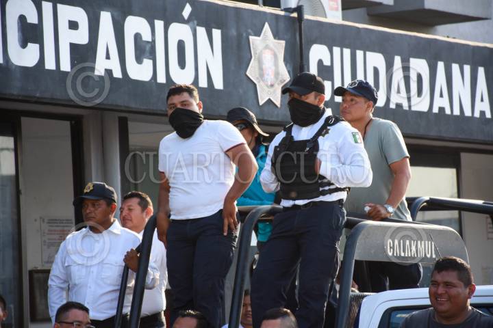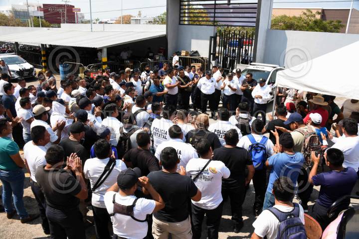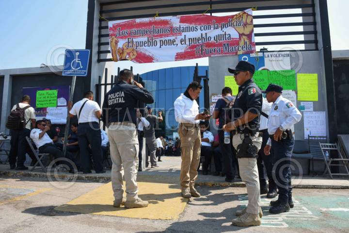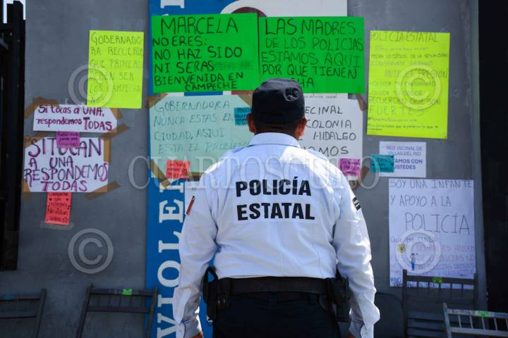 CAMPECHE, CAMPECHE 18MARZO2024.- En el tercer día de protesta de la Policía Estatal de Campeche, varios representantes de policías de los municipios se sumaron a la protesta en el estado, hoy fueron visitados por la comisión de derechos humanos, donde varias integrantes de mujeres valientes de la policía rompieron el silencio y denunciaron los malos tratos que han recibido, además del motín fallido de la semana pasada donde fueron usadas sin explicarles de que tipo de operativo se trataba. Los elementos exigen la renuncia de la secretaria de seguridad Marcela Muñoz y de los directores policiacos. FOTO: MICHAEL BALAM/CUARTOSCURO.COM