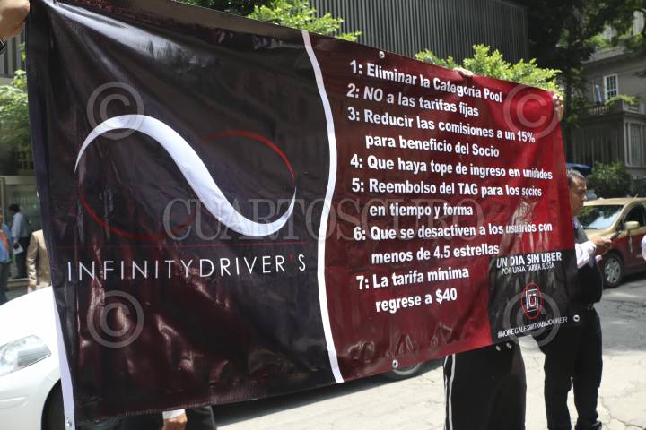 CIUDAD DE MEXICO, 15JULIO2016.- La Unión de Socios de UBER realizaron una protesta a las afueras de las instalaciones de UBER ubicado en la calle de Hamburgo en la zona rosa para mostrar su inconformidad ante las bajas tarifas y las penalizaciones que la empresa que impone a los chóferes así mismo informaron que como medida de presión a partir de este viernes suspenderán el servicio UberPool, una función que permitía compartir el viaje con otros usuarios. Ante dicha protesta la compañía no reconoció los cobros de viajes realizados. FOTO: SAÚL LÓPEZ /CUARTOSCURO.COM