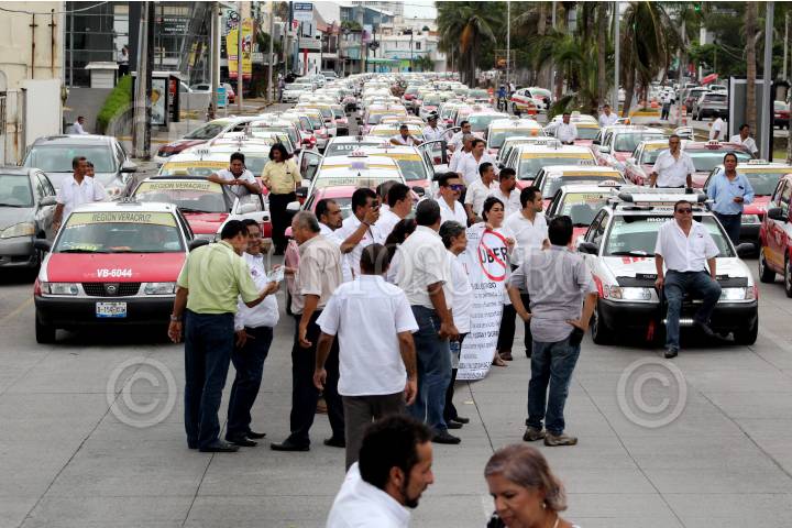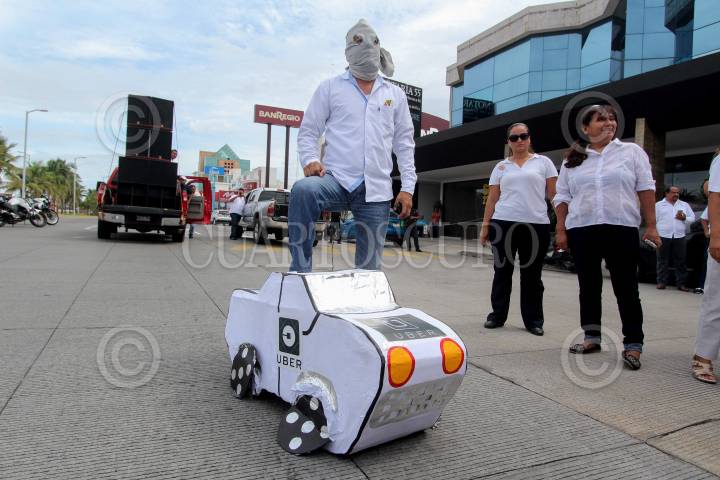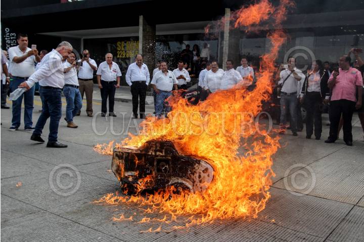 XALAPA, VERACRUZ., 21AGOSTO2018.- Taxistas de la zona conurbada Veracruz- Boca del Rio marcharon y quemaron simbólicamente un UBER de cartón como protesta ante la posible entrada de esta modalidad de transporte publico privado en la capital del estado. FOTO: ALBERTO ROA /CUARTOSCURO.COM