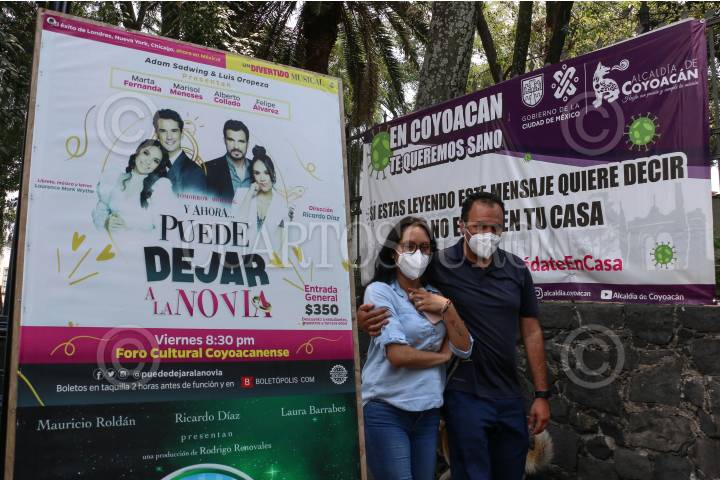 Una pareja camina entre carteles de obras de teatro y una lona de advertencia por COVID-19, en la alcaldía Coyoacán.