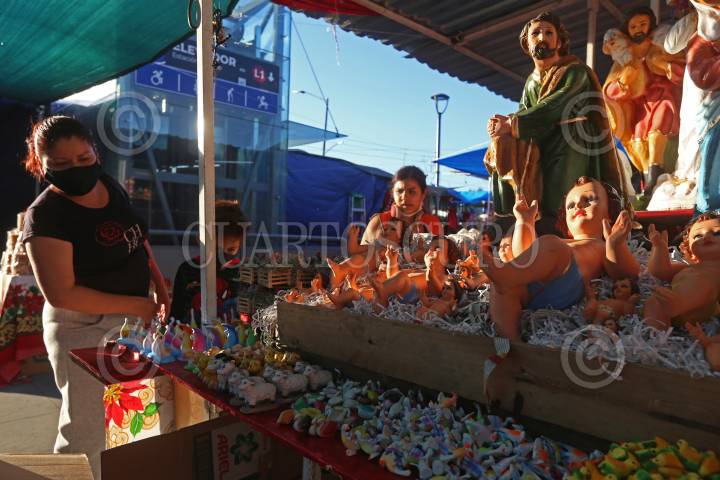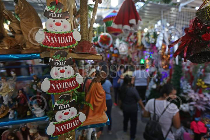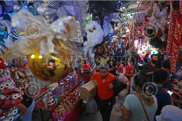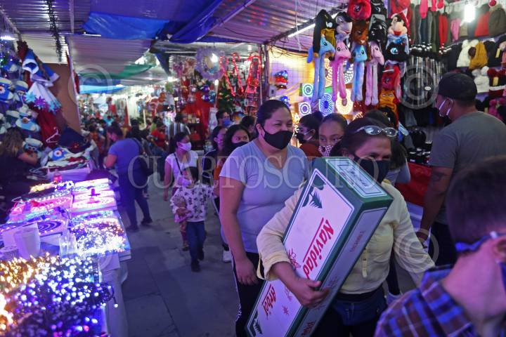 Visitantes al tianguis navideño del Parque el Refugio, caminan por los pasillos de la feria navideña en busca de artículos para adornar sus hogares en estas fechas.