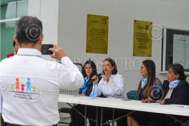 TOLUCA, ESTADO DE MÉXICO, 27SEPTIEMBRE2024.- Integrantes del Frente Nacional por la Familia en el Estado de México ofrecieron un pronunciamiento de rechazo a lo que consideran una indebida intromisión del IEEM en agendas ideológicas que promueven políticas de eliminación de población mexiquense, e hicieron un llamado a los diputados mexiquense para legislar a favor de la población. FOTO: CRISANTA ESPINOSA AGUILAR /CUARTOSCURO.COM