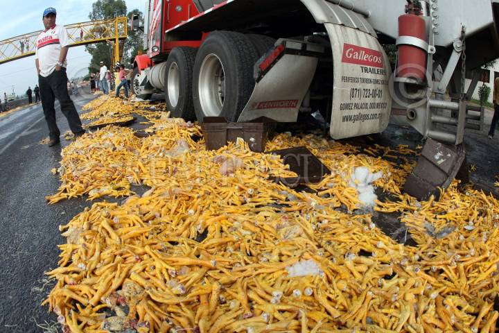 SALAMANCA, MORELIA, 09AGOSTO2009.- Un trailer que contenía pollo se accidento contra la barda de contencion de la carretera Salamaca-Morelia, provocando que cientos de toneladas de pollo callaren al piso. FOTO: ISAAC ORTIZ/CUARTOSCURO.COM